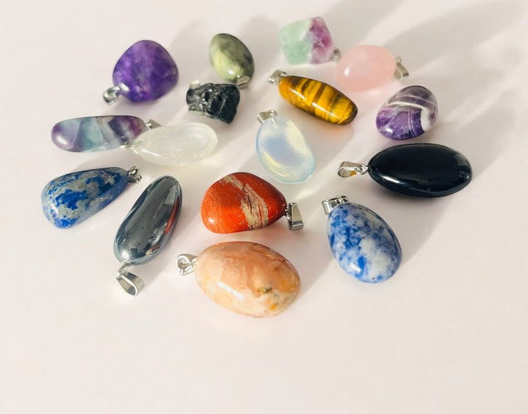 Ciondoli in pietra naturale con collana in acciaio inox.Nelle note specificare se si acquista per un uomo o una donna,così sarà inserita la collana apposita.